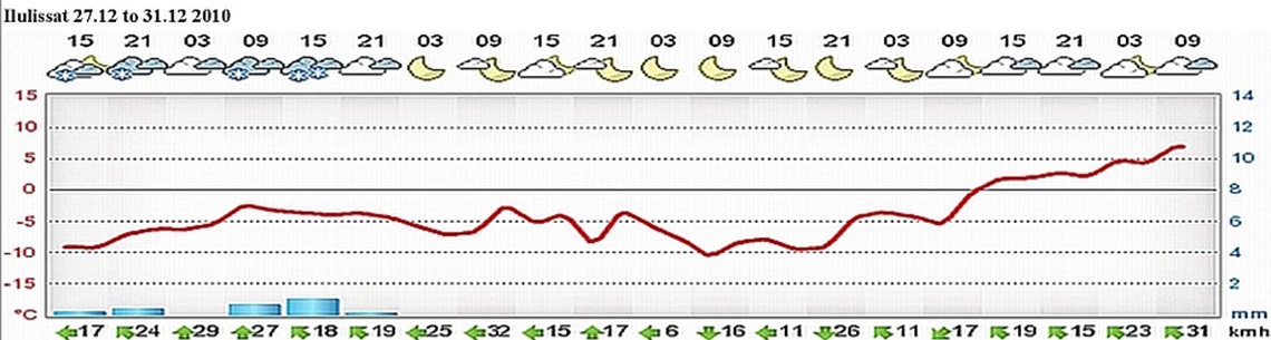 Føhnvind kan forekomme i området hele året. Dette er en varm og tør vind fra indlandsisen, som kan få temperaturen til at stige 10-20 grader inden for et par timer. Om vinteren kan føhnen få sne og is til at tø, hvorefter kulden vender tilbage og giver en hård skorpe af is på sneen.