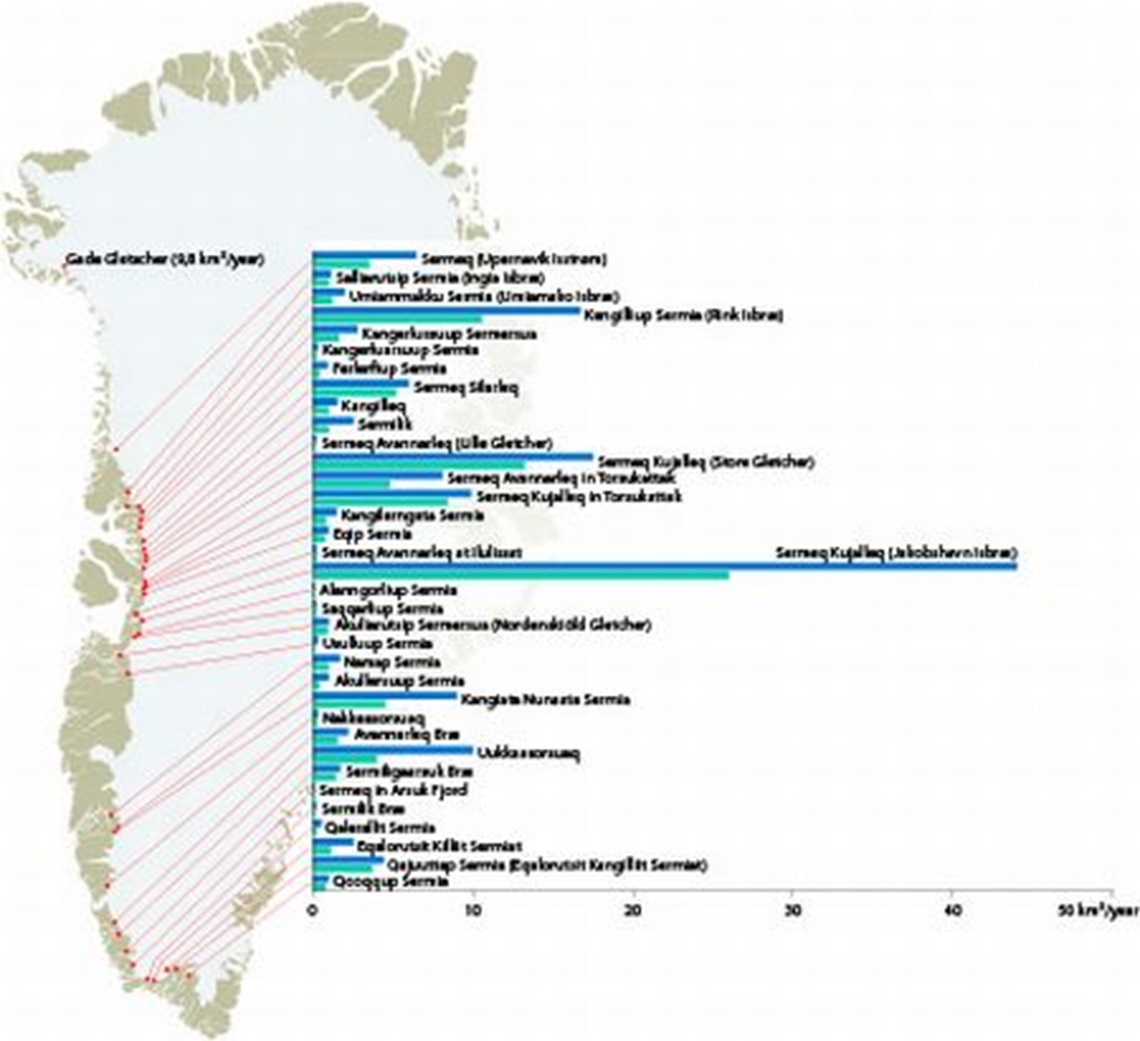 - Sermermit iigartartumit ilulissat anginerpaat kaanngartut 1.5 kubikkilometerit sinnerlugit angissuseqarput. Assigaat arsaattarfiit 30-t, Mount Everestitut portutigisumik sermimik qallersimaneqartut. Iluliat taama ittoq ataaseq Danmarkimi innuttaasut imermik pilersugarisinnaavaat ukiuni arfineq-marlungajanni!